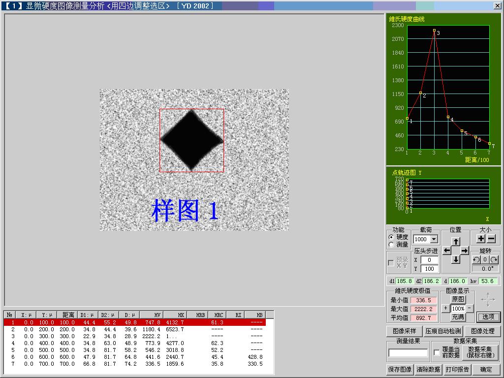 該功能將根據(jù)用戶繪制的邊框,采集原始數(shù)據(jù),并根據(jù)相關(guān)硬度公式,得出硬度值,其中:“位置X” 、“位置Y”是指硬度痕跡圖像中心的X、Y坐標(biāo),該數(shù)據(jù)由人工輸入;“D1” 、“D2” 、“D” 、“HV”由軟件自動得出。數(shù)據(jù)采集界面如下: